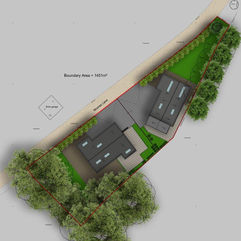 Private client, Planning Approval obtained in 2021 for a detached 500sqm two-storey and single storey 300sqm dwelling within a mature environment and offering generous gardens. Scale and orientation of the proposal respects its surrounding and overlooking. A sustainable energy efficient project in harmony with the existing majestic oaks trees and maximizing views towards them. Strategic placed cedar cladding offering a homogeneous proposal.
